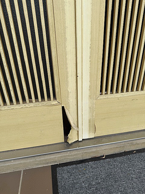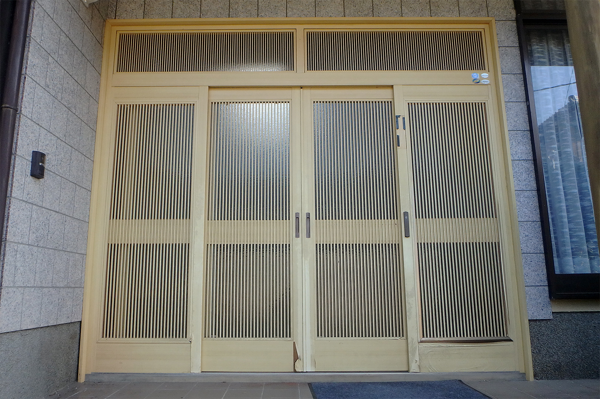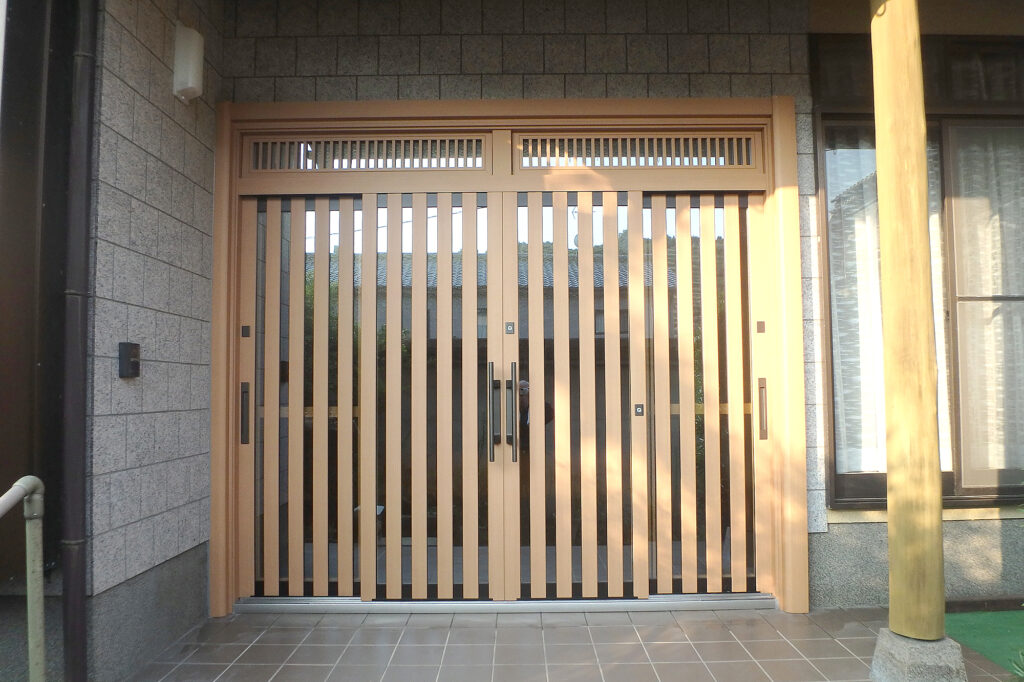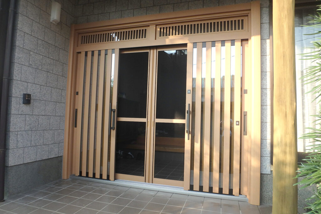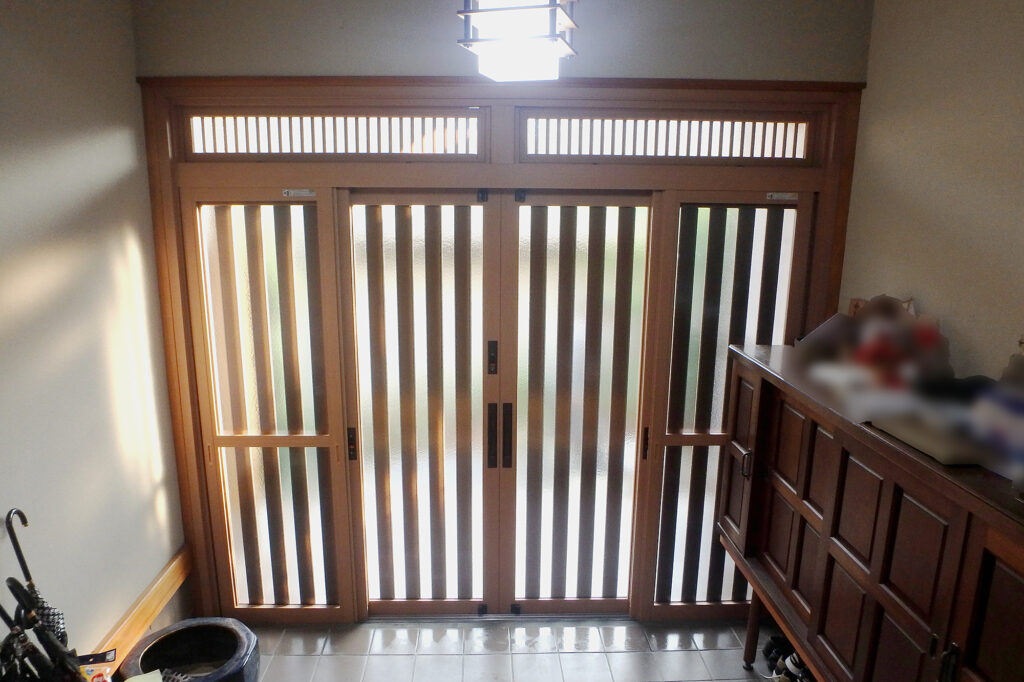 熊本市西区 玄関引き戸リフォーム(N様邸) サッシ・ガラス X Facebook LINE コピー 2025.10.18 施工前 築30年以上経ち、玄関引き戸のラミネートが剥がれてボロボロになってきたので壊れてはいないけど、見た目が悪いので取替をご希望。 施工後 -お施主様の声-人が集まるので、その前に工事できて良かったです。見た目もとても明るくなりました。格子が太いので丈夫そうです。 YKK APドアリモ 玄関引き戸A01 木目柄:新槇 4枚建 ランマ付(Low-E複層ガラス遮熱タイプ・ブルー)※断熱性・遮熱性の高い複層ガラスを使用しています。
