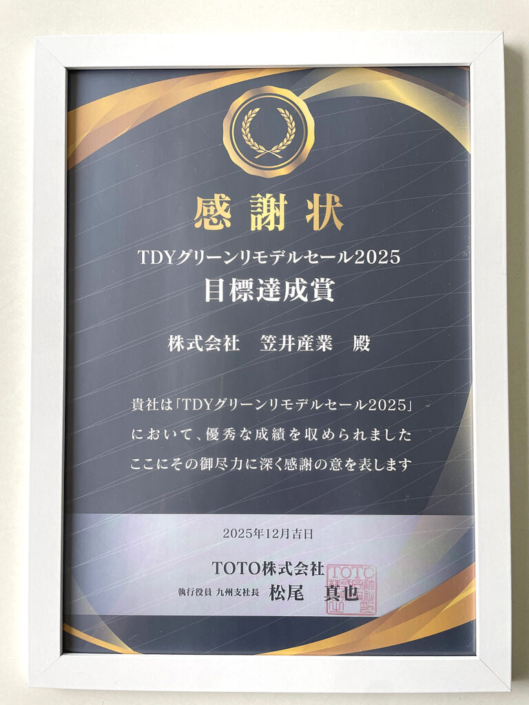 2026.1.28(水)TDYグリーンリモデルセール2025目標達成 GoGoリフォーム王Blog X Facebook LINE コピー 2026.01.30 感謝状頂きました! TOTO・ダイケン・YKK APのメーカー3社の売上コンテストのTOTO部門で自社の目標を達成したということで感謝状を頂きました。 ありがとうございました。