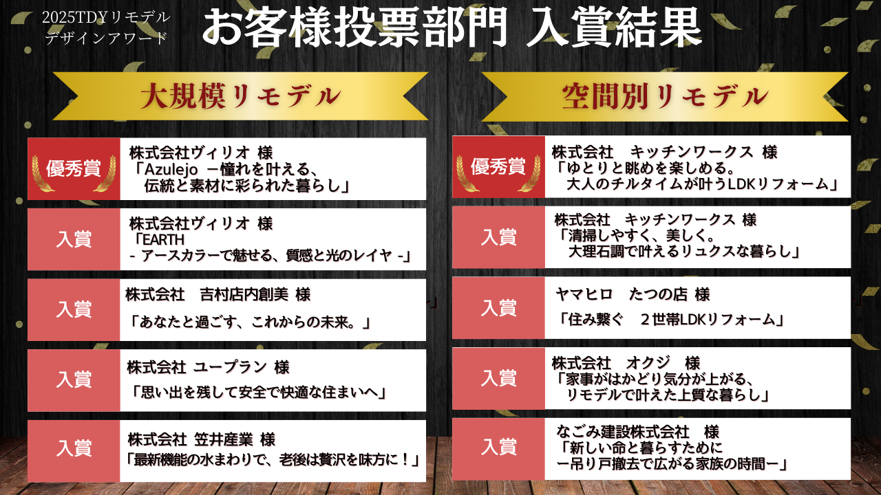 TDYリモデルデザインアワード2025お客様投票部門の結果発表があり、弊社がエントリーされていた【大規模リモデル部門】で全国101件の中から、第5位に入賞しました。